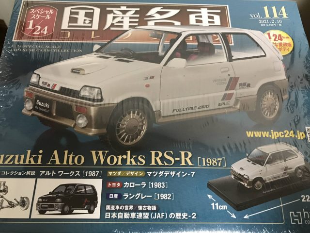 さてTwitterを見ていたら・・・1/24国産名車コレクションに1987アルトワークスRS-Rが発売されたことを知りました。大好きなクルマであり、これは欲しいと。ところが・・・まだ発売から数日しか経ていないにも関わらずネット上では売り切れ。近所のツタヤと落合書店へ行くもやはり無し。