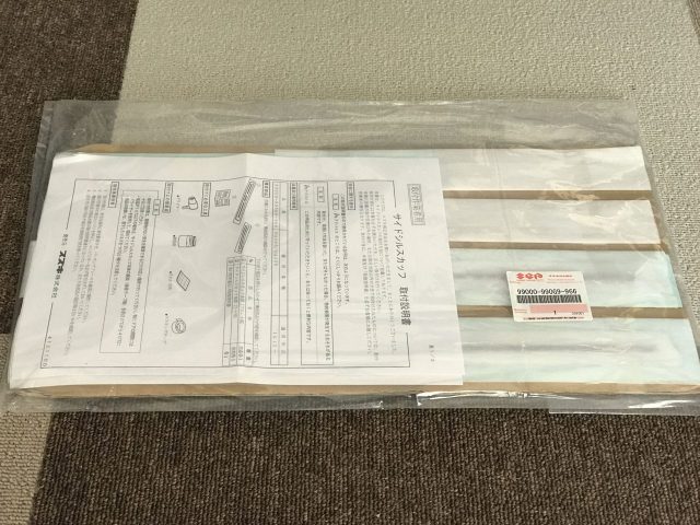 ブツはこれ。スズキ純正サイドシルスカッフとやらです。でもサイドシルスカッフプレートではありません。プレートじゃないんですよ。