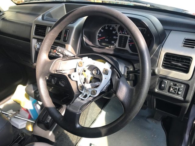まずはステアリング交換。このウレタンステアリング、どうにも違和感がありまして・・・。持ち主も同様だったようで。案の定、センターナットがなかなか緩まなくて。