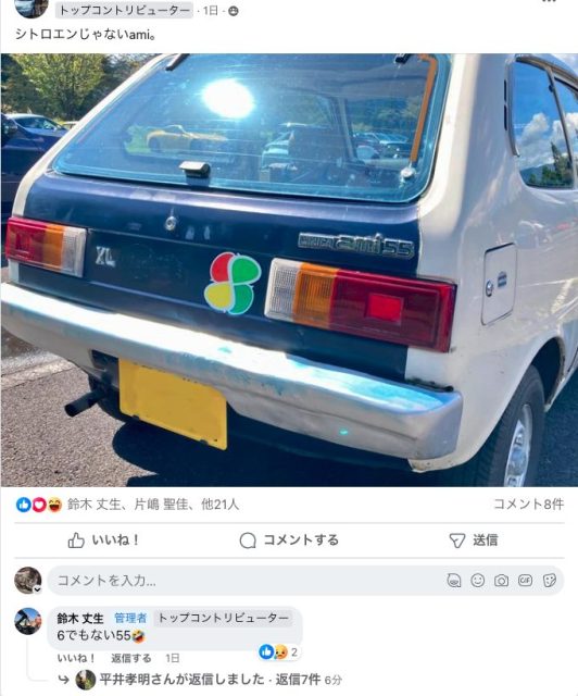 「シトロエンじゃないami」に対して「6でもない55」というコメント。この集まりの方々はミニカアミ55を知らない人が多く(この時点で浅はかな車好きばかりだなと感じますが)、シャレのつもりで「シトロエンami6でもami8でもない、ami55だよ」というつもりで投稿されたようなのですが、これがカナ読みしてみると・・・「ろくでもない55」と読めてしまうんですよね。オーナーさん、大ショックで悲しんでいました。それを聞いて私も憤慨中。A系ミニカを馬鹿にされた気持ちでいっぱいになってしまいました。おそらくは解釈の行き違いが生じてしまったというところなんでしょうけれどね。